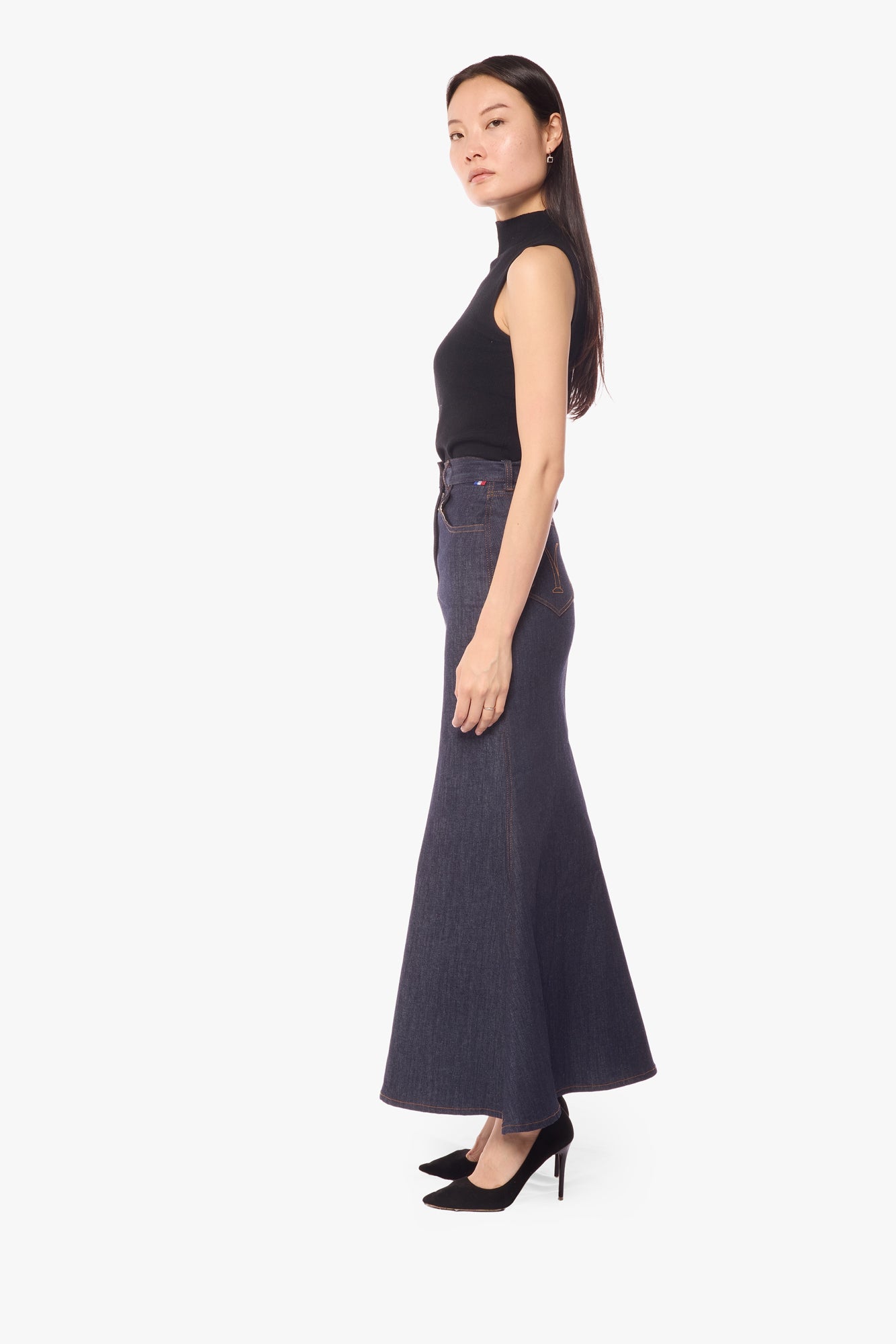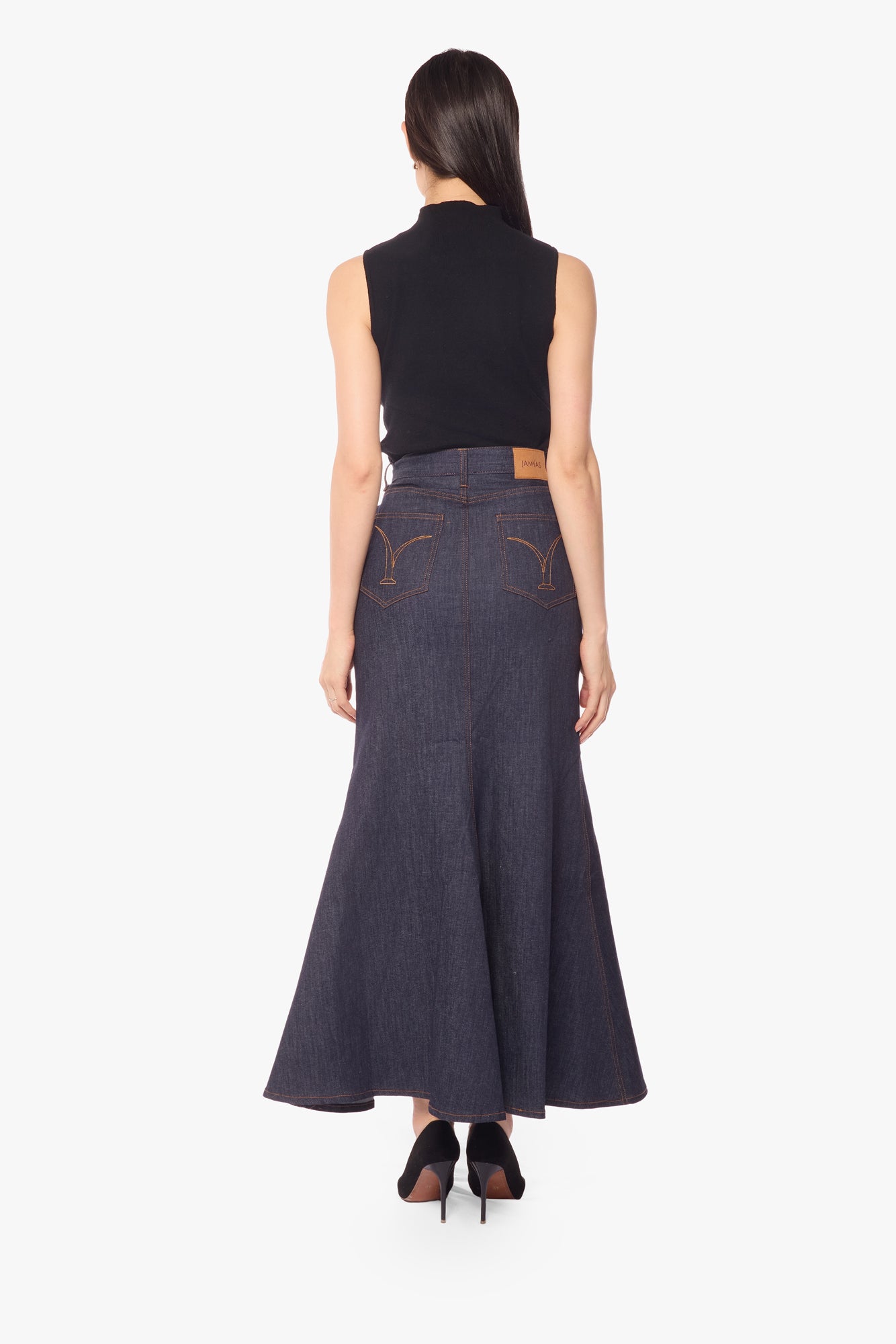 Essayez-la une fois et vous ne voudrez plus la quitter. Cette jupe longue en denim brut, sans aucun lavage, s’inspire des silhouettes élégantes des années 1930. Ajustée au niveau des hanches, elle s’ouvre en forme cloche à partir des mollets, dessinant une allure féminine et affirmée.